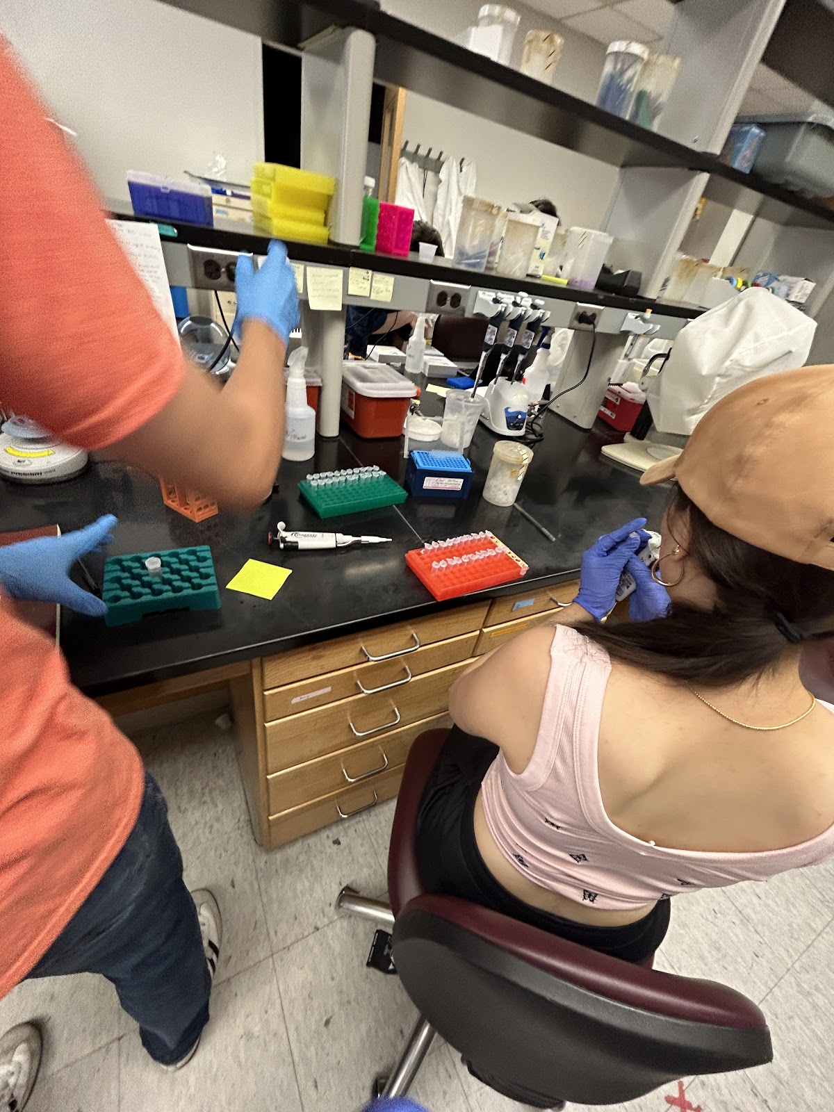 | Here is Izi and I working together to add Rnase A to each sample and inverting each sample 25 times. |